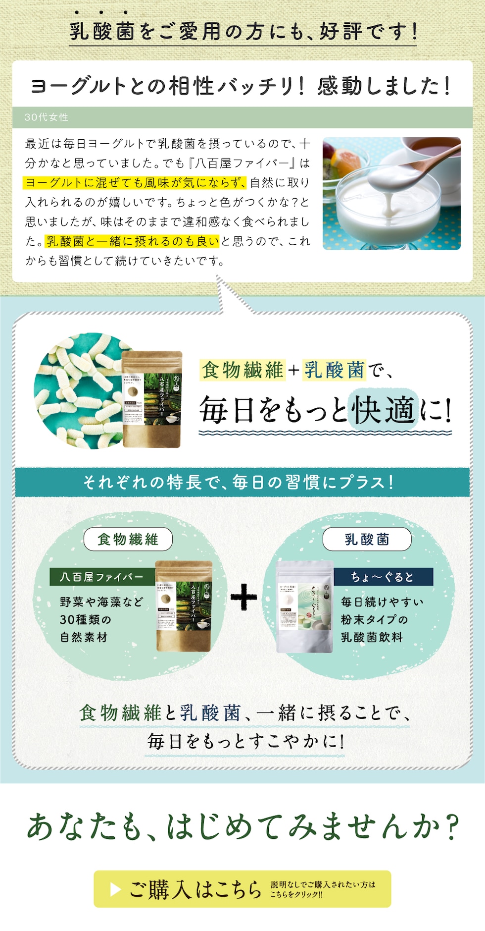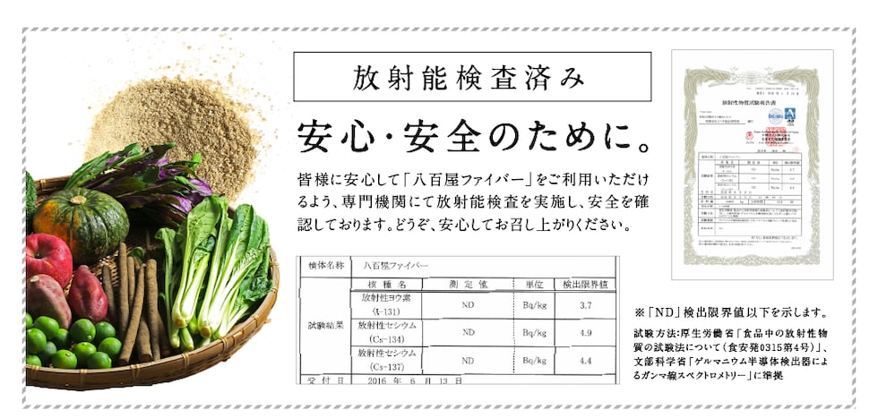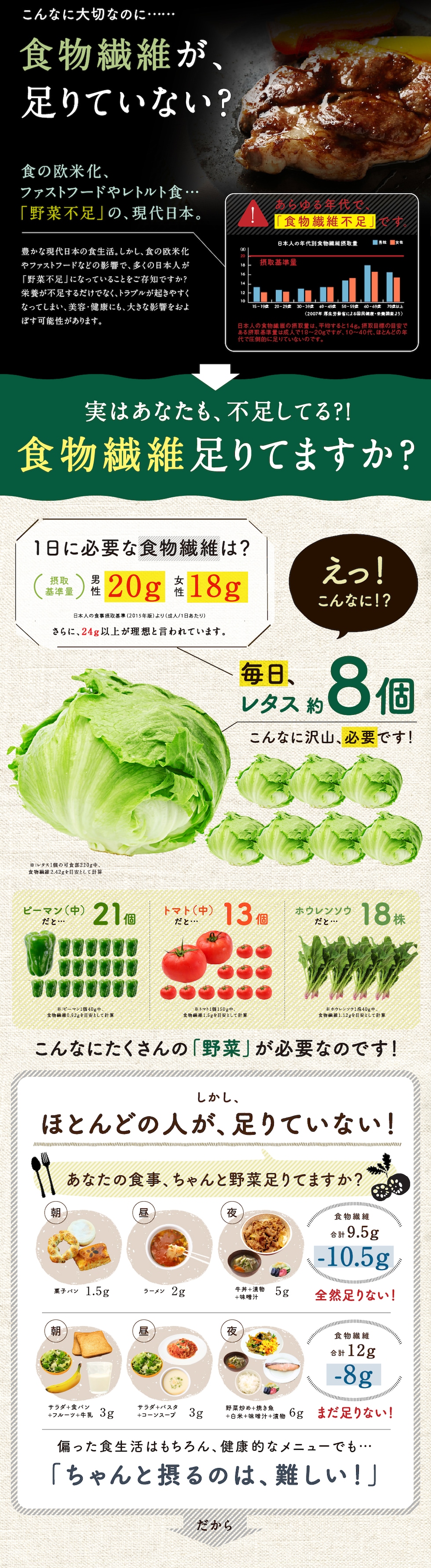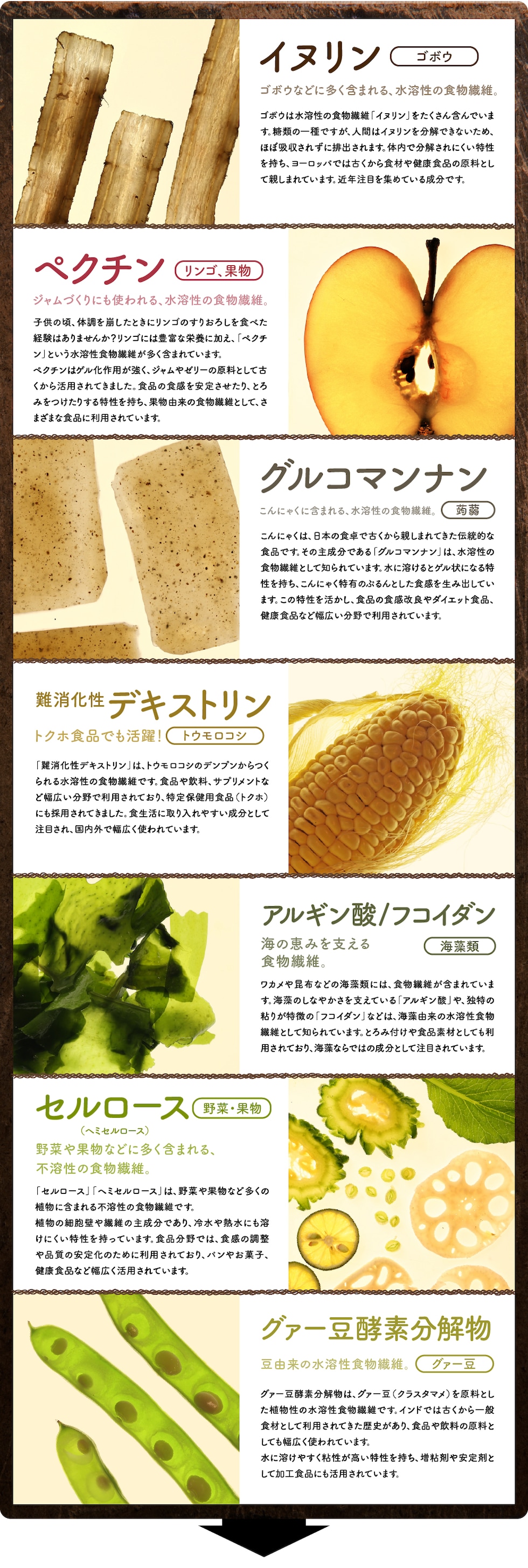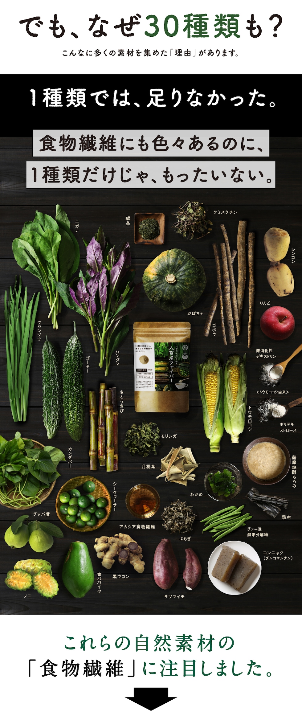 水溶性食物繊維、アカシア食物繊維、りんご繊維、ポリデキストロース、グァー豆酵素分解物、こんにゃく粉、野菜ミックス粉(クヮンソウ、さとうきびバガス、カンダバー、青パパイヤ、グァバ葉、クミスクチン、月桃葉、ゴーヤー、シークヮーサー、ニガナ、ノニ葉、ハンダマ、モリンガ、緑茶、黒ウコン、ヨモギ)、トウモロコシ粉末、レンコン粉末、かぼちゃ粉末、サツマイモ粉末、ゴボウ粉末、わかめ粉末、昆布粉末、薩摩焼酎もろみ末