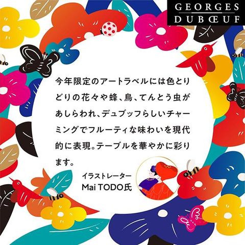色とりどりの花々や蜂、鳥、てんとう虫が描かれたアートラベルは、自然豊かなボジョレーの畑を表現し、テーブルを華やかに彩ります