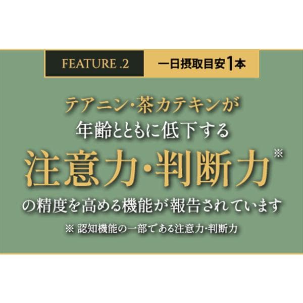 BMIが高めの方の体脂肪を減らす・BMIを改善する「ガレート型カテキン」と、年齢とともに低下する注意力・判断力の精度を高める機能が報告されている「テアニンと茶カテキン」を含有する機能性表示食品です。