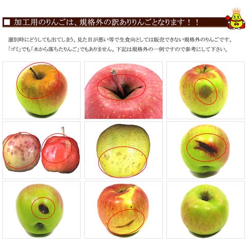 ■加工用/訳あり:1箱 約9~10kg(22~60玉前後) ※品種・重さ・玉数のご指定はお受けできません。 ※蜜入はお約束できません。 ※加工用のりんごとなるため、生食には向きません。 ご了承の上でご注文をお願い致します |