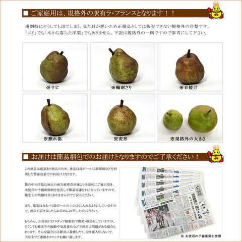 ■バラ詰めの規格箱に新聞紙を使用して再梱包しますので、大きさにより内容量が1割程度前後します。予めご了承ください。 ■軸の部分を指で押して柔らかさを感じれば食べごろです。 ■正規品と同じく農家さんが大切に育てたラ・フランスですが・・・、傷・軸刺さり・日焼け・変形・サビ等の訳ありラ・フランスをお得な価格で産地直送でお届けします。 農家さんからの直接買付だから出来る安さと新鮮さをぜひご賞味下さい♪ らふらんす、ラフランス、ラ・フランス、梨、洋梨、自宅用、家庭用、訳あり、わけあり、山形、山形県、山形産、山形県産、産地直送、送料無料 |
