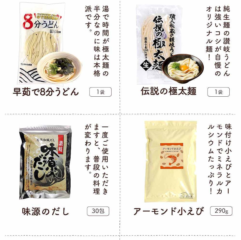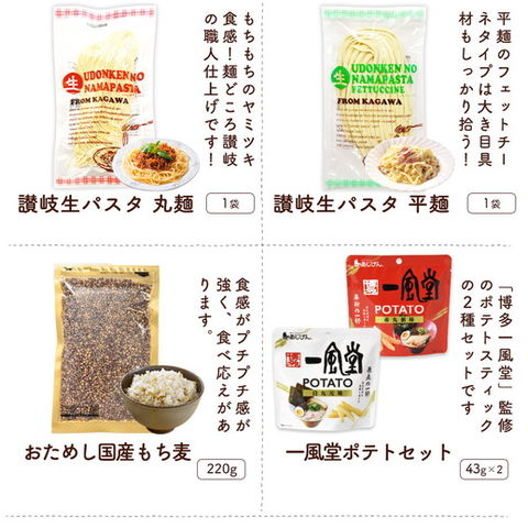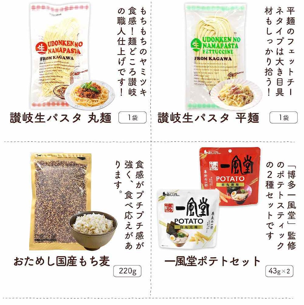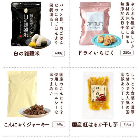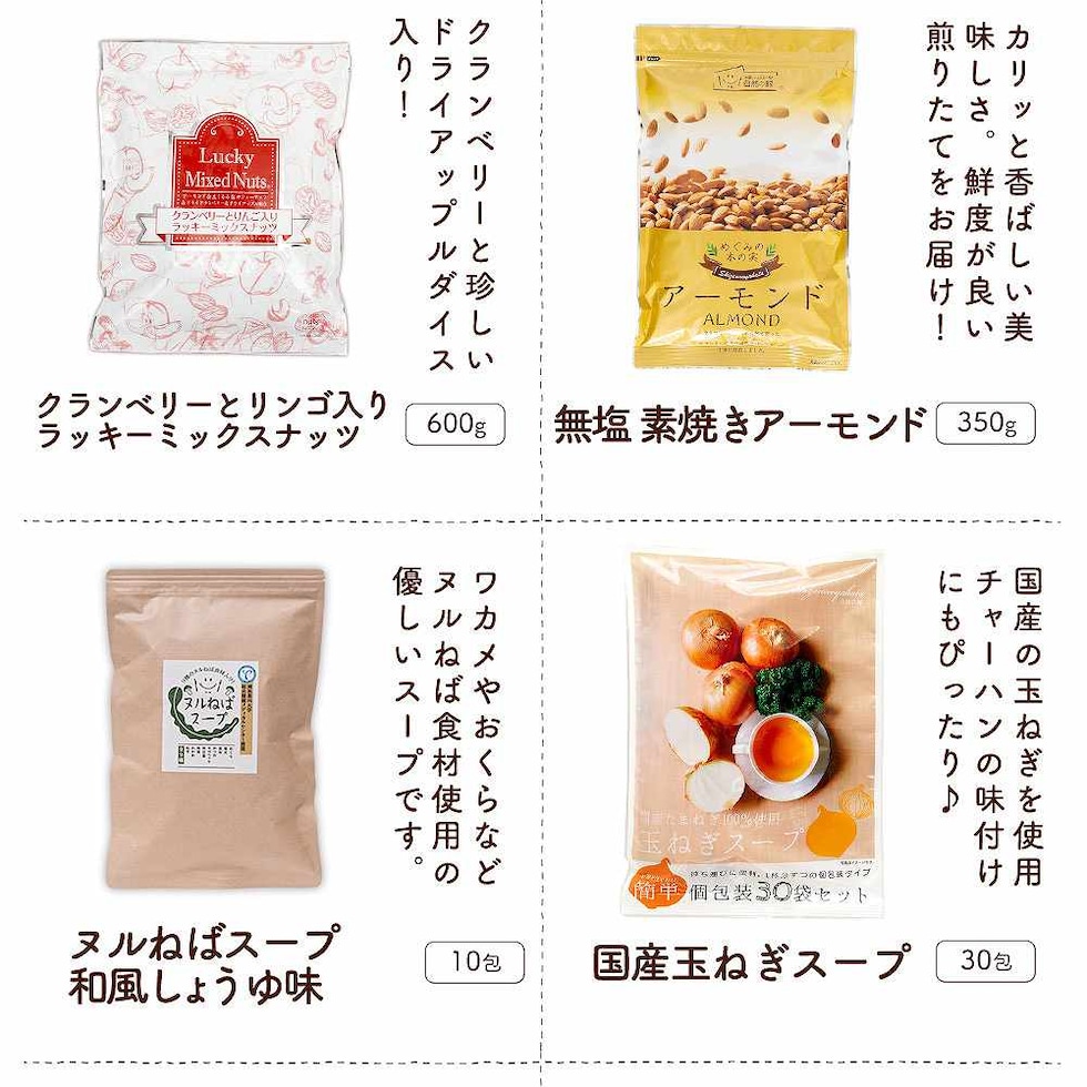 | セット内容 | ・無塩ラッキーミックスナッツ 600g ・未来雑穀21+マンナン 400g ・白の雑穀 400g ・寒天海藻サラダ業務用 260g ・ドライいちじく 350g ・こんにゃくジャーキー 160g ・国産干し芋 150g ・クランベリーとりんご入りラッキーミックスナッツ 600g ・無塩素焼きアーモンド 350g ・ヌルねばスープ和風しょうゆ 10包 ・国産たまねぎスープ 30包 ・8分うどん 220g ・伝説の極太麺 200g ・味源のだし 30包 ・アーモンド小えび 290g ・讃岐生パスタ丸麺 200g ・讃岐生パスタ平麺 200g ・国産もち麦 220g ・一風堂ポテト赤丸新味 ・一風堂ポテト白丸元味 全20品 原材料など詳細は各商品ページよりご確認下さい。(商品名をタップ) 参照ページと本セットの内容量が異なる場合がございます。 |