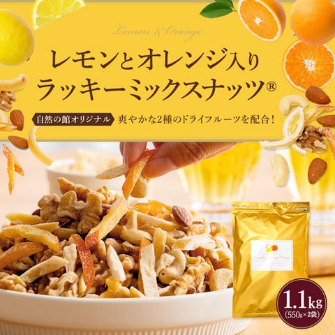 自然の館オリジナル★人気の「ドライフルーツ入りミックスナッツシリーズ」に新シリーズ登場! ほろ苦く程よい甘さのレモンピール&爽やかな香りとほろ苦い甘さのオレンジピールに3種のナッツを配合★毎日楽しめるたっぷり大容量1.1kg!