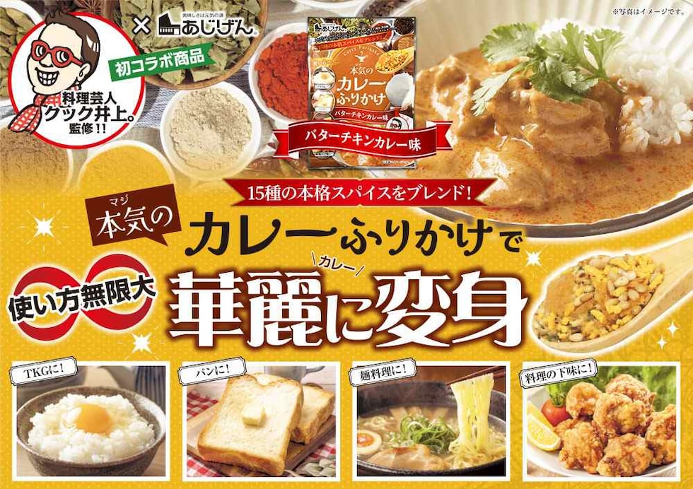 料理芸人クック井上。監修のもと、スパイスの種類や風味にこだわり抜いて作ったカレーふりかけ。ご飯にかけるだけじゃない、調味料や下味としても使える万能ふりかけです。