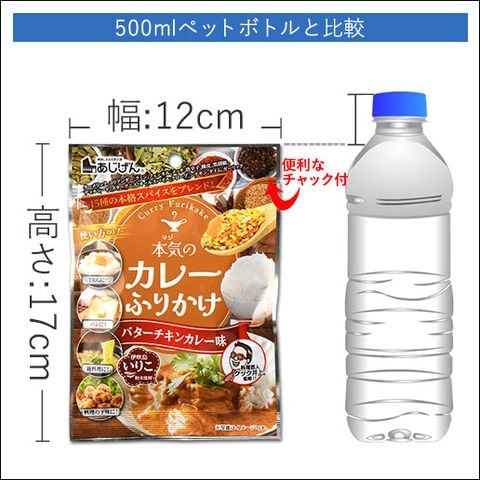 | 原材料名 | いりごま(国内製造)、バターチキンカレー風味顆粒(でん粉、食塩、乳糖、カレーパウダー、砂糖、その他)、かたくちいわし粉末、パセリ、にんじんフレーク、かつお節粉末/調味料(アミノ酸等)、香料、クチナシ色素、(一部に小麦・乳成分・ごま・大豆・鶏肉を含む) |