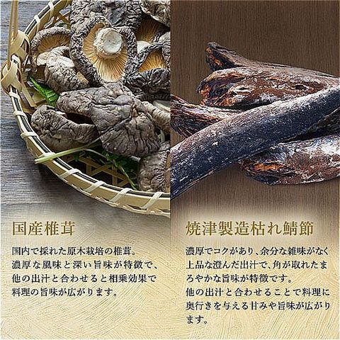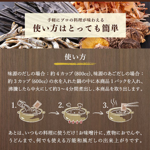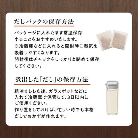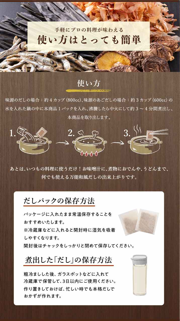 | ご使用方法 | ■だしをとる場合 1、約3カップの水を入れた鍋の中にだしパック1包を入れます。 2、沸騰したら中火にして約3~4分間煮出し、だしパックを取り除きます。 ■調味料として使う場合 だしパックの個包装を開封して、炒め物などに粉末調味料としてもお使いいただけます。調理時に味を確かめながらお好みで調節してください。 |