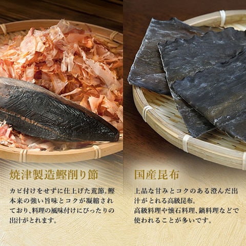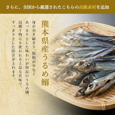 | 原材料名 | 食塩(国内製造)、砂糖、飛魚粉末、煮干うるめ鰯粉末、鰹削り節粉末、粉末しょうゆ、鯖節粉末、酵母エキス、昆布粒、椎茸粉末、食用植物油脂/調味料(アミノ酸等)、(一部に小麦・さば・大豆を含む) |