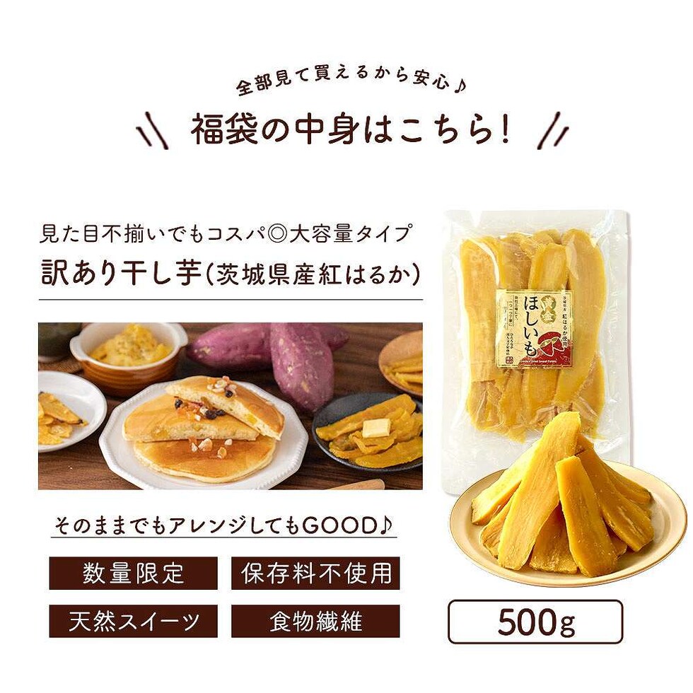 ・訳あり干し芋500g(規格外品 B級平切) ・皮付き甘栗720g ・割れおかきミックス1kg 全3品 原材料など詳細は各商品ページよりご確認下さい。(商品名をタップ) |