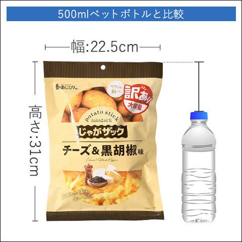 | 原材料名 | ポテトスティック(じゃがいも(中国)、植物油)、チーズシーズニング、食塩、ブラックペッパー/調味料(アミノ酸等)、香料、甘味料(甘草、ステビア)、パプリカ色素、(一部に乳成分・小麦・大豆・鶏肉を含む) |