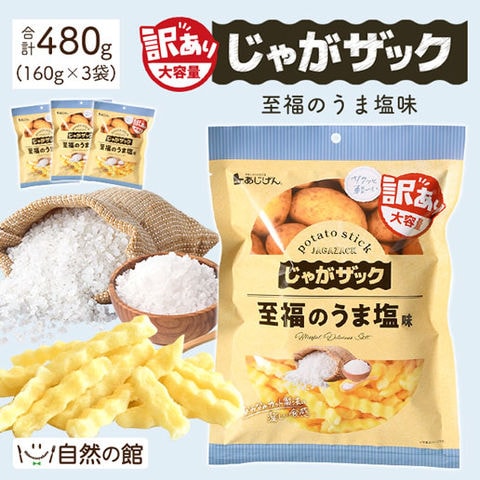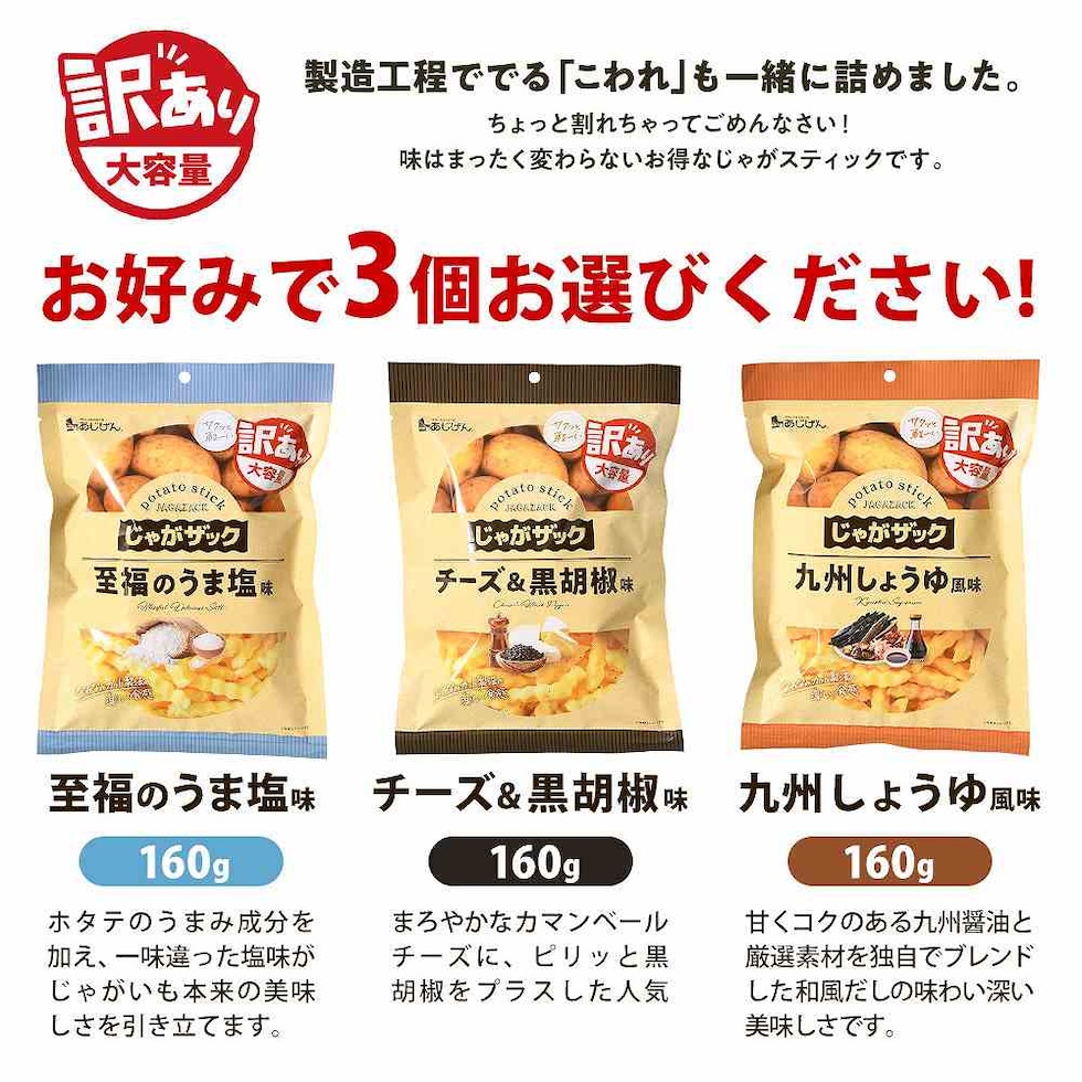 【至福のうま塩味】じゃがザック 160g×3個 送料無料 味源 メーカー直販 クリンクルポテト ポテトスティック じゃがスティック ビール おつまみ お菓子 訳あり(簡易梱包) あじげん