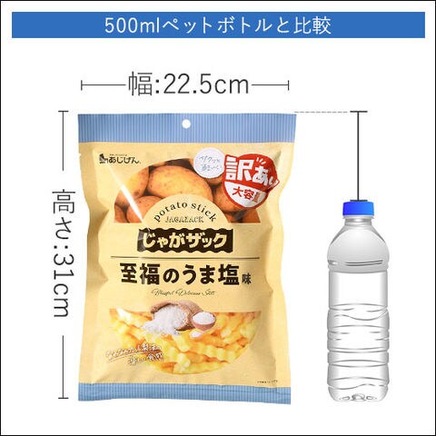 | 原材料名 | ポテトスティック(じゃがいも(中国)、植物油)、至福のうま塩シーズニング/調味料(アミノ酸等)、リン酸Ca、甘味料(ステビア)、(一部に豚肉を含む) |