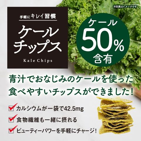 ケール50%配合のケールチップス!青汁が苦手な方でも、チップスから手軽にケールを摂取できます。持ち運びも可能なのでいつも気が付いたときに召し上がりいただけます。