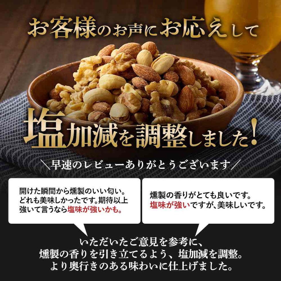 | 原材料名 | 燻製アーモンド(アーモンド(アメリカ)、植物油、食塩)、燻製くるみ、燻製カシューナッツ(カシューナッツ、植物油、食塩)、燻製ピスタチオ(殻付きピスタチオ、食塩)、食塩/調味料(アミノ酸等) |