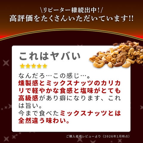 | 原材料名 | 燻製ピーナッツ(落花生(アメリカ)、植物油、食塩)、燻製アーモンド(アーモンド、植物油、食塩)、燻製カシューナッツ(カシューナッツ、植物油、食塩)、燻製ジャイアントコーン(ジャイアントコーン、植物油、食塩、胡椒)、食塩/調味料(アミノ酸等) |