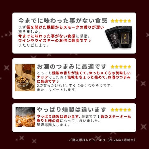 ~燻酔~燻りに酔う“本物の燻香”をまとった贅沢なおつまみが遂に完成! 桜の煙でじっくりいぶした本格仕上げ!深く広がる香りに思わず酔いしれる、大人の燻製ミックスナッツです。