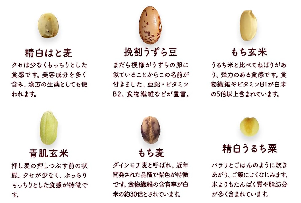 | 原材料名 | 裸麦α(大麦(国産))、黒米、裸押し麦、もち麦、赤米、黄大豆(割り)、黒千石大豆、青大豆(割り)、黒大豆(割り)、青肌玄米、小豆(割り)、発芽玄米、緑米、精白ひえ、いんげん豆(割り)、精白もち粟、精白もちきび、精白はと麦、精白うるち粟、うずら豆(割り)、発芽もち玄米 |