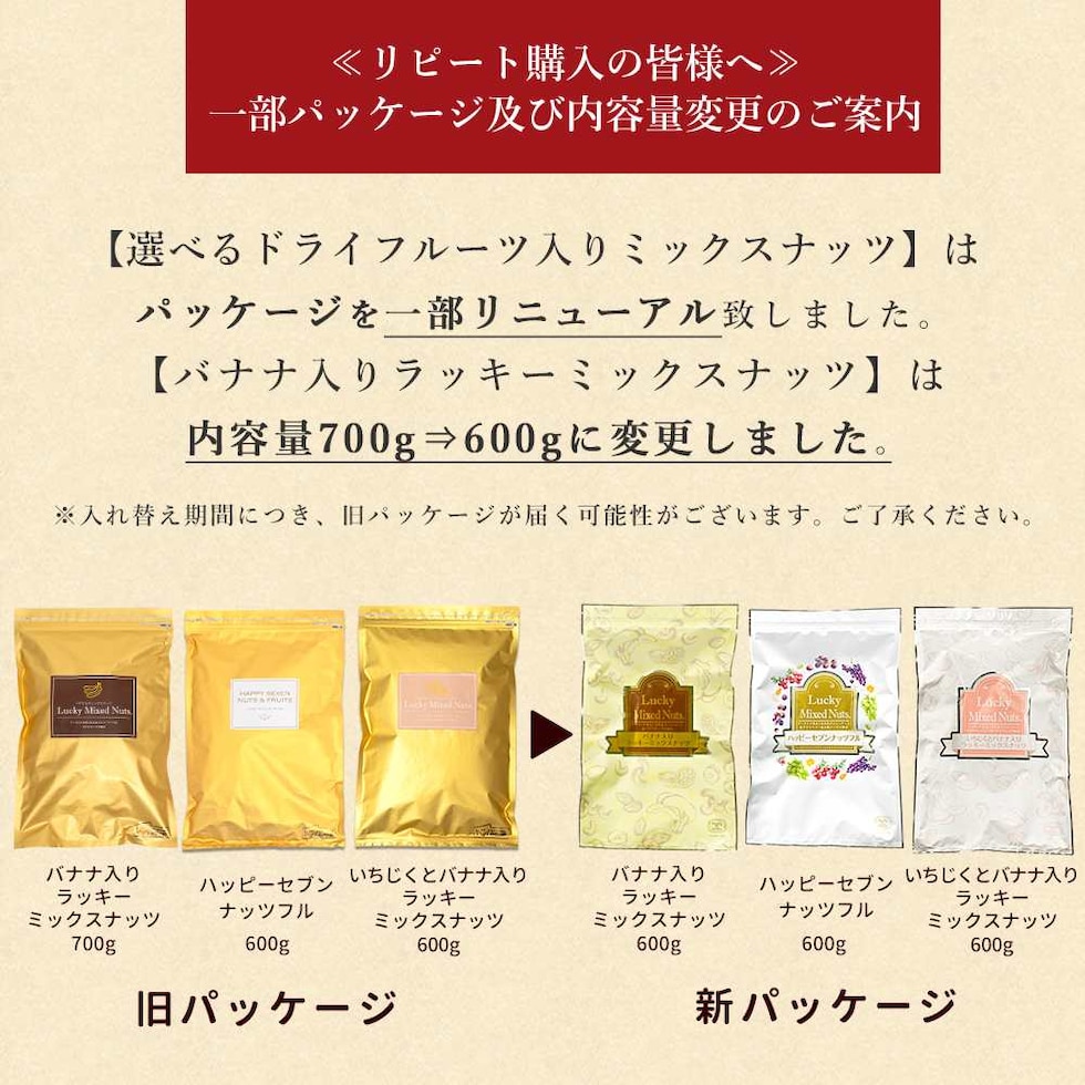 | 内容量 | ・クランベリーとりんご入りラッキーミックスナッツ600g ・レーズン入りラッキーミックスナッツ600g ・バナナ入りラッキーミックスナッツ600g ・ハッピーセブンナッツフル600g ・いちじくとバナナ入りミックスナッツ600g |