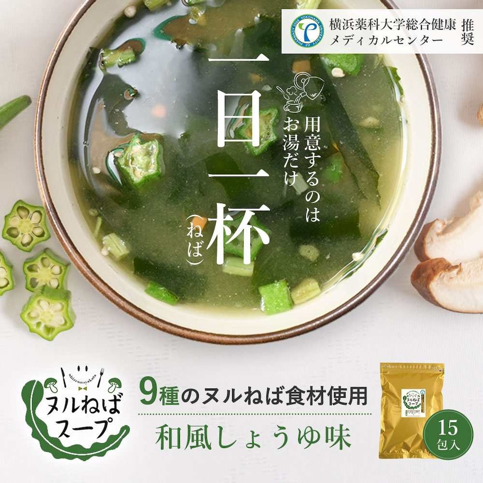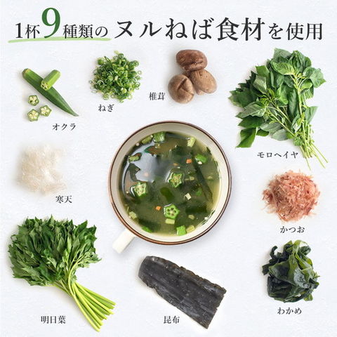 9種類のヌルねば食材使用!横浜薬科大学 総合健康 メディカルセンター推奨の、毎日飲みたいヌルねばスープです。かつおだしがベースの和風醤油味は、そのままスープとして飲んでも、うどんやごはんを入れても◎!