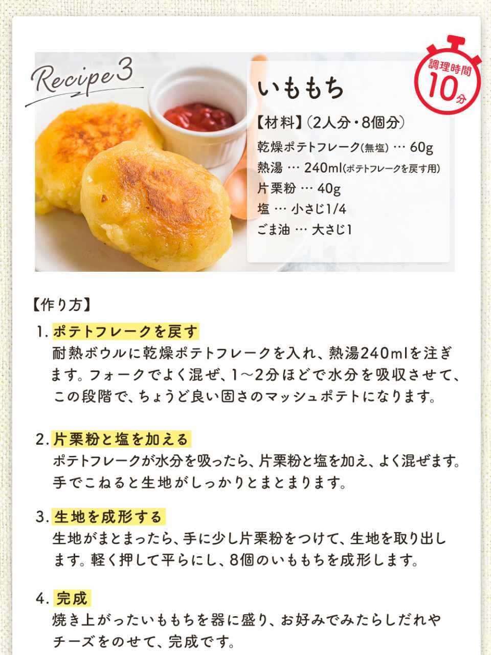 | 調理方法 | <マッシュポテトの作り方> ポテトフレーク1に対し、約80℃のお湯4を加え30秒程混ぜます。2分程度蒸らすと美味しい裏ごしポテトができあがります。 ※用途により、お湯の量を加減してください。 ※調理時のやけどにご注意ください。 マッシュポテトをベースにポテトサラダなどにアレンジもOK!スープのとろみ付けなどにもご活用いただけます。 |