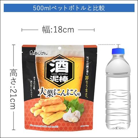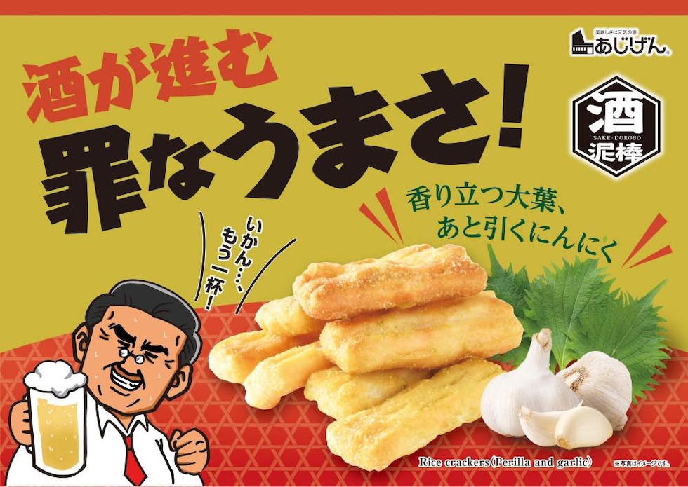 ビールはもちろん、晩酌や日本酒とも相性がよく、食中のおつまみに最適な”おつまみ米菓”!| 原材料名 | 棒おかき(もち米(中国)、植物油、食塩)、大葉シーズニング、にんにくシーズニング、食塩/調味料(アミノ酸等)、香料、香辛料抽出物、リン酸Ca、(一部に小麦・大豆・豚肉を含む) |