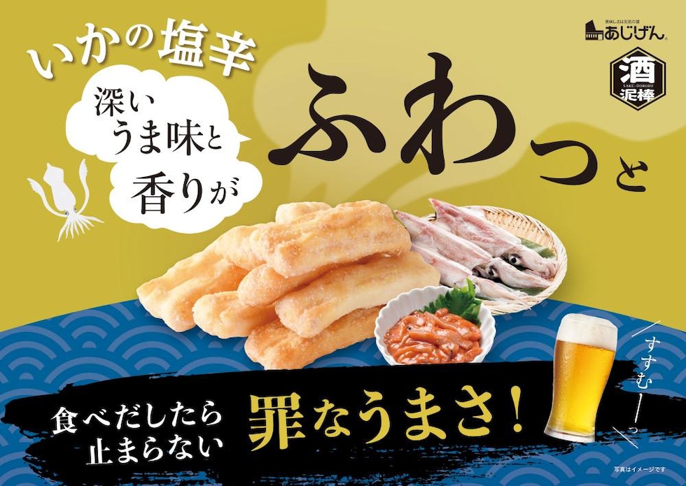 ビールはもちろん、晩酌や日本酒とも相性がよく、食中のおつまみに最適な”おつまみ米菓”!| 原材料名 | 棒おかき(もち米(中国)、植物油、食塩)、塩辛風シーズニング(いかを含む)/調味料(アミノ酸等)、加工でん粉、香料、リン酸Ca、甘味料(ステビア) |