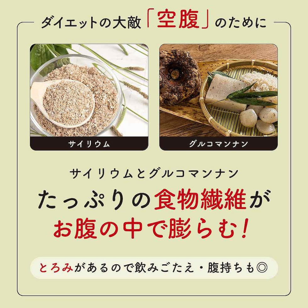 サイリウム・グルコマンナンの2種の食物繊維がお腹の中で膨らむので腹持ちも◎!お水や牛乳などで割ってお楽しみいただけます。