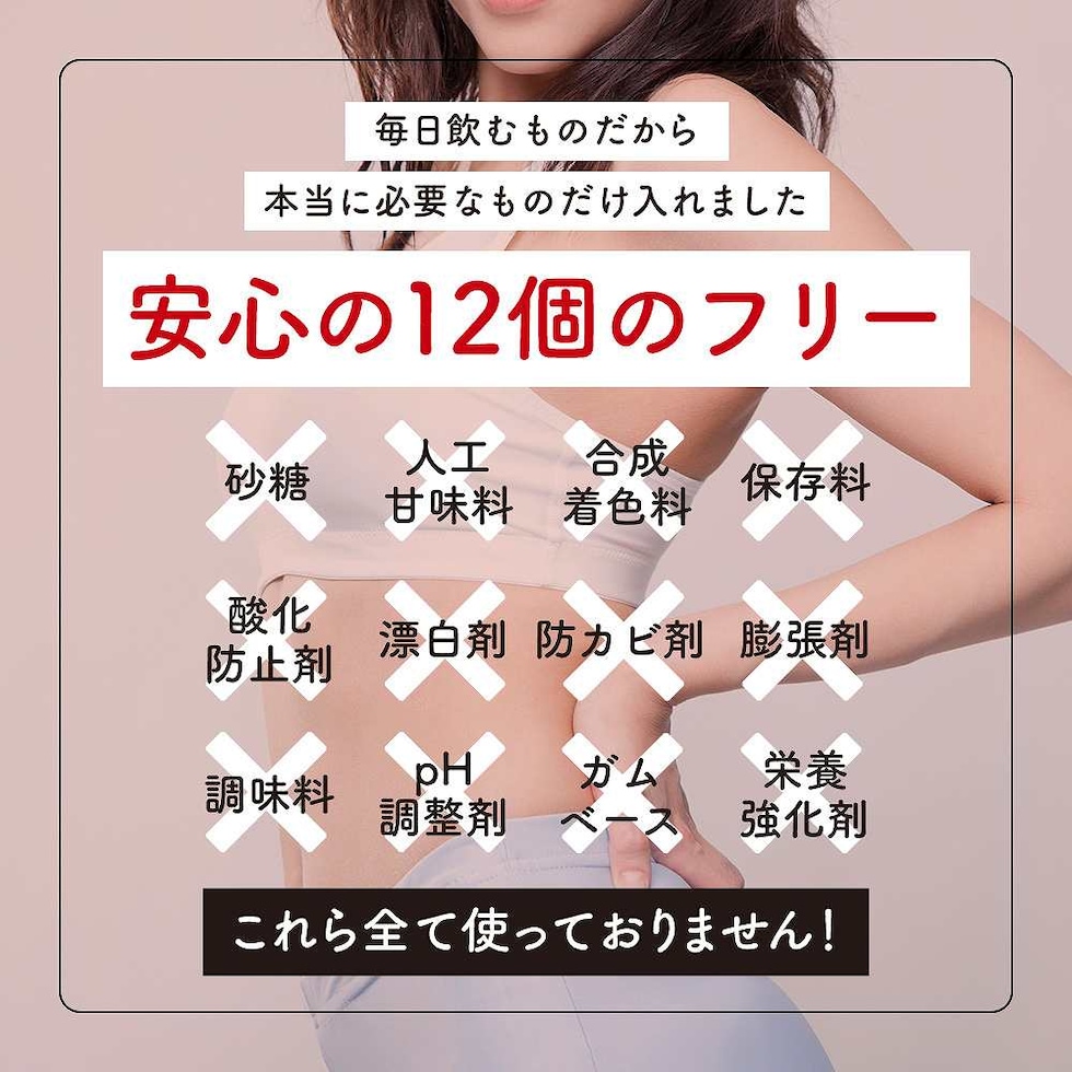 | 原材料名 | マルトデキストリン(国内製造)、難消化性デキストリン、プランタゴ・オバタ末、コンニャクイモ抽出物、果汁混合粉末、アフリカマンゴノキエキス、植物発酵物乾燥粉末(デキストリン、植物発酵生成物)、植物発酵エキス末(デキストリン、植物発酵エキス)、コラーゲンペプチド、ドロマイト、乳酸菌末(乳酸菌、デキストリン)/クエン酸、甘味料(ステビア)、増粘多糖類、香料、着色料(紅麹、スピルリナ青)、V.C、ビオチン、V.K、抽出V.E、ナイアシン、パントテン酸Ca、V.B1、V.B6、V.B2、V.A、葉酸、V.D、V.B12、(一部に大豆・りんご・オレンジ・キウイフルーツ・もも・バナナ・カシューナッツ・ごま・ゼラチンを含む) |