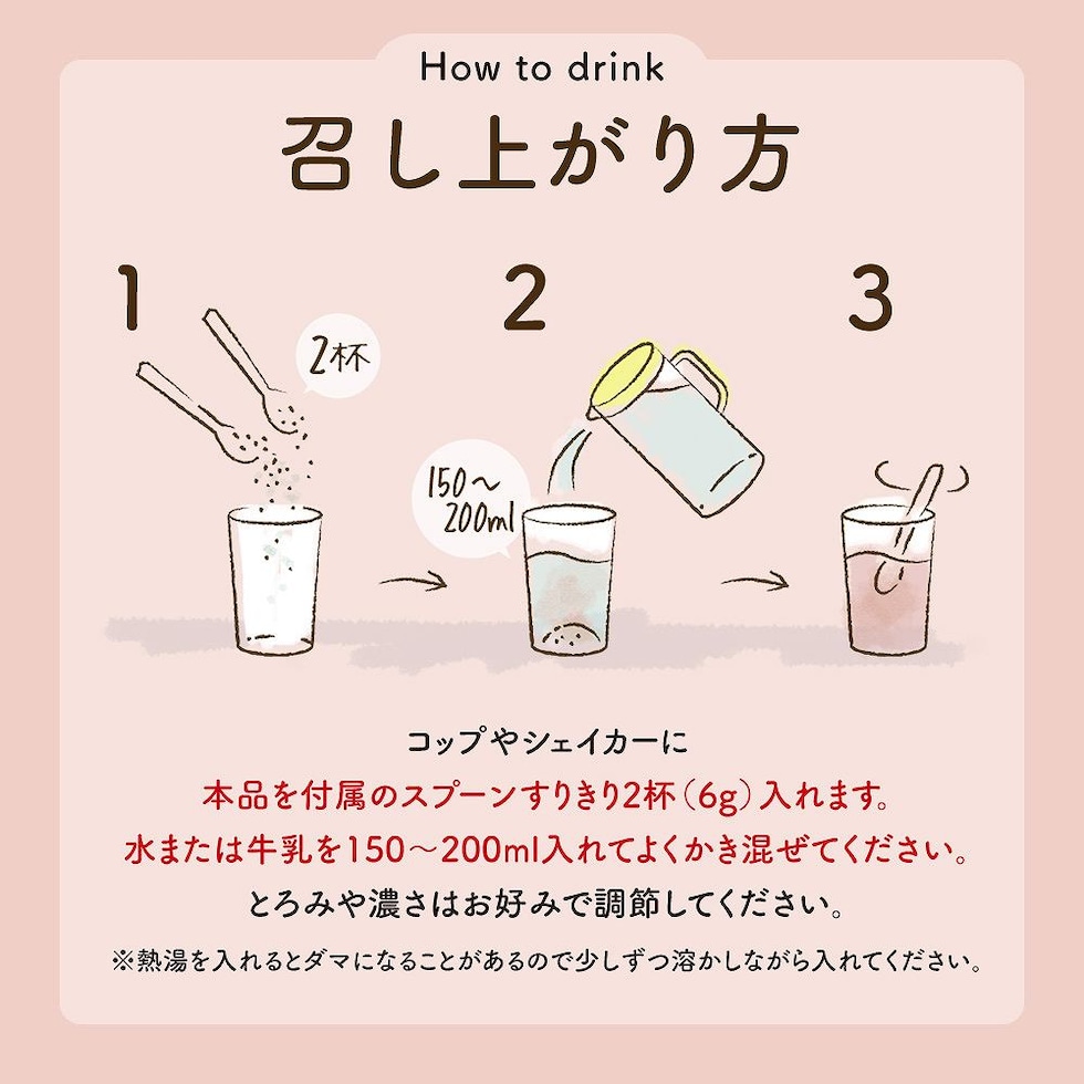 | 召し上がり方 | 1日あたり約6g(付属のスプーンすりきり2杯)を目安に、150~200ml程度の水または牛乳などに溶かして召し上がりください。 量はお好みに合わせて調整してください。 |