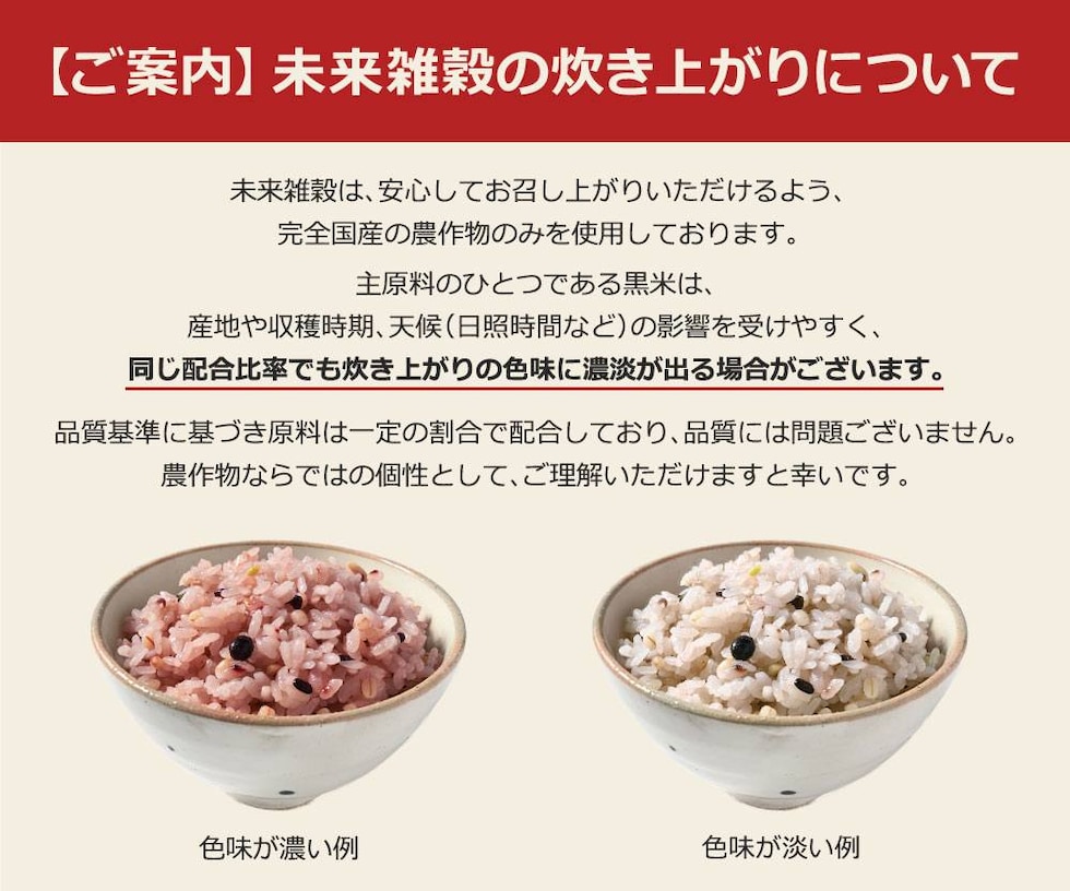 | 原材料名 | 裸麦α(大麦(国産))、黒米、裸押し麦、もち麦、黄大豆(割り)、黒千石大豆、青大豆(割り)、黒大豆(割り)、青肌玄米、小豆(割り)、発芽玄米、緑米、米粒状こんにゃく加工食品、精白ひえ、いんげん豆(割り)、精白もち粟、精白もちきび、精白はと麦、精白うるち粟、トウモロコシ(割り)、うずら豆(割り)、発芽もち玄米/加工デンプン、グルコン酸Ca、増粘剤(アルギン酸Na)、調味料(有機酸) |