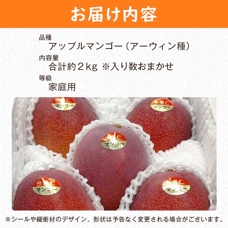 マンゴー 沖縄 完熟マンゴー ご家庭用 2kg 今帰仁村 アップルマンゴー アーウィン種 冷蔵便 同梱不可 指定日不可【7月中旬~8月下旬頃・期間内発送予定】【早い者勝ち!数量限定6980円→1180円OFF★5800円セール】