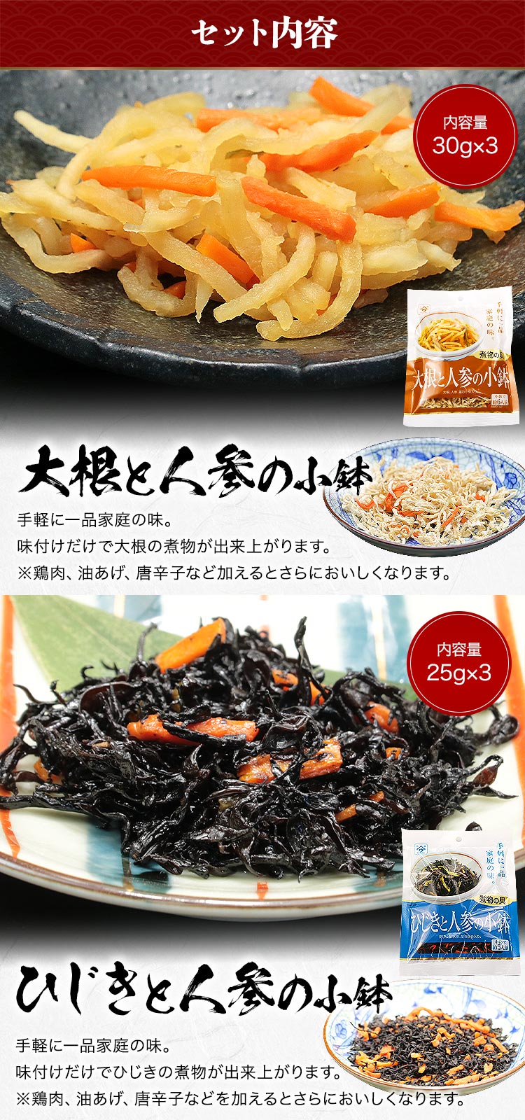 芽ひじき(中国産)、乾燥人参(人参、ぶどう糖)、茎わかめ
