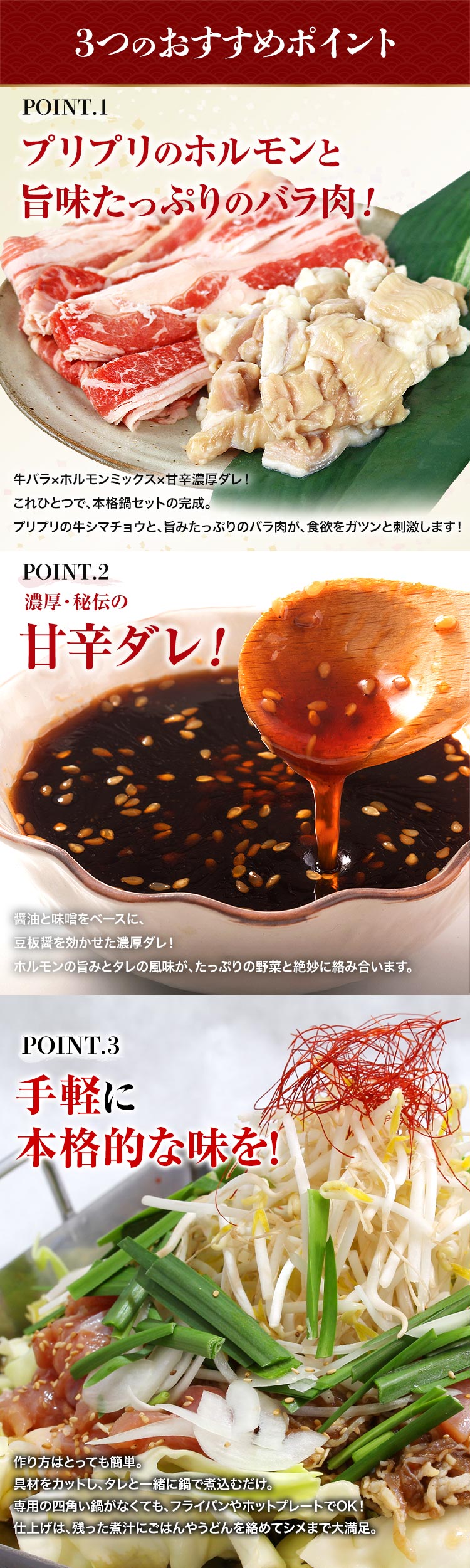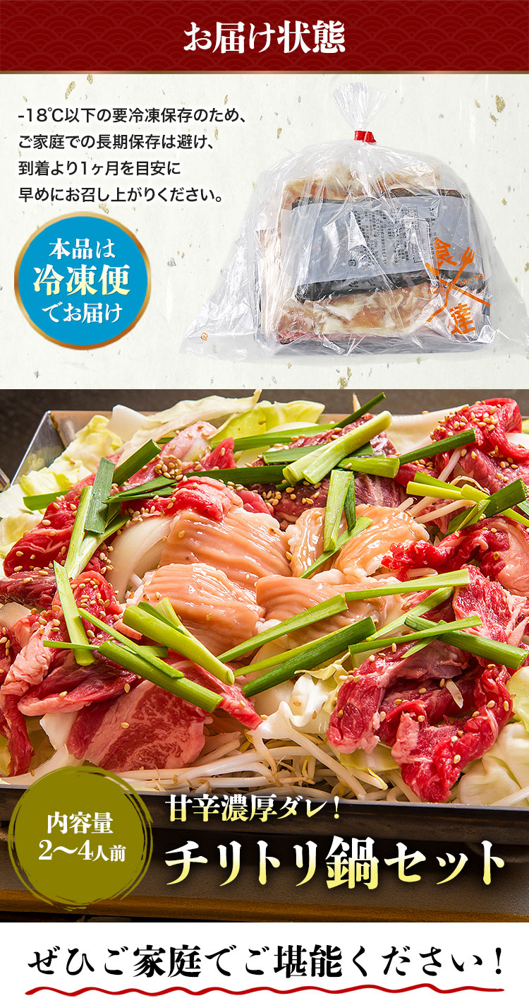 牛バラ・ホルモンミックス・甘辛濃厚ダレがセットになった本格鍋セットです。