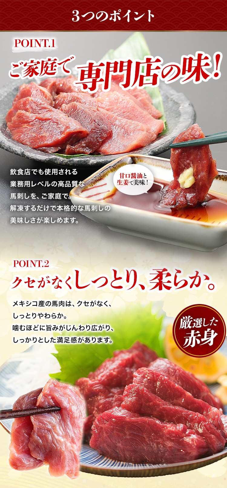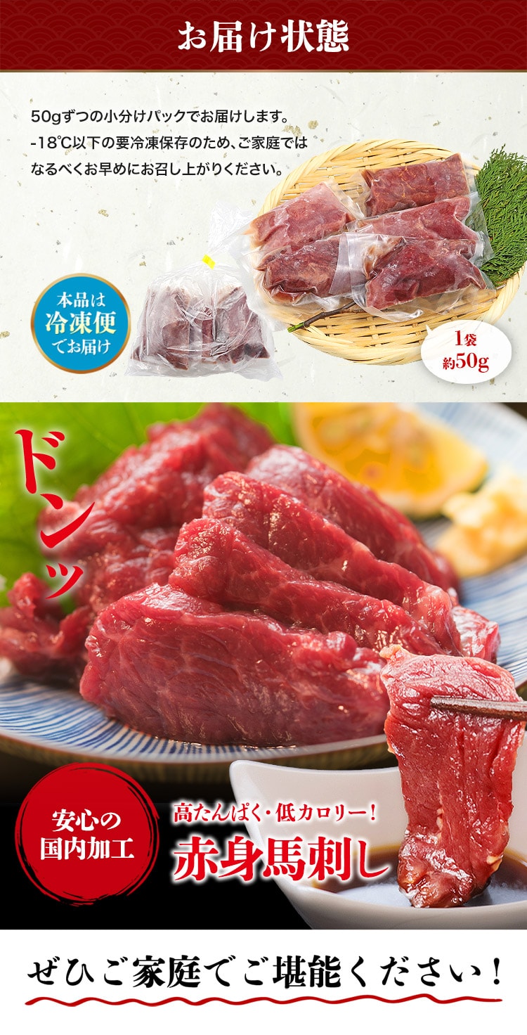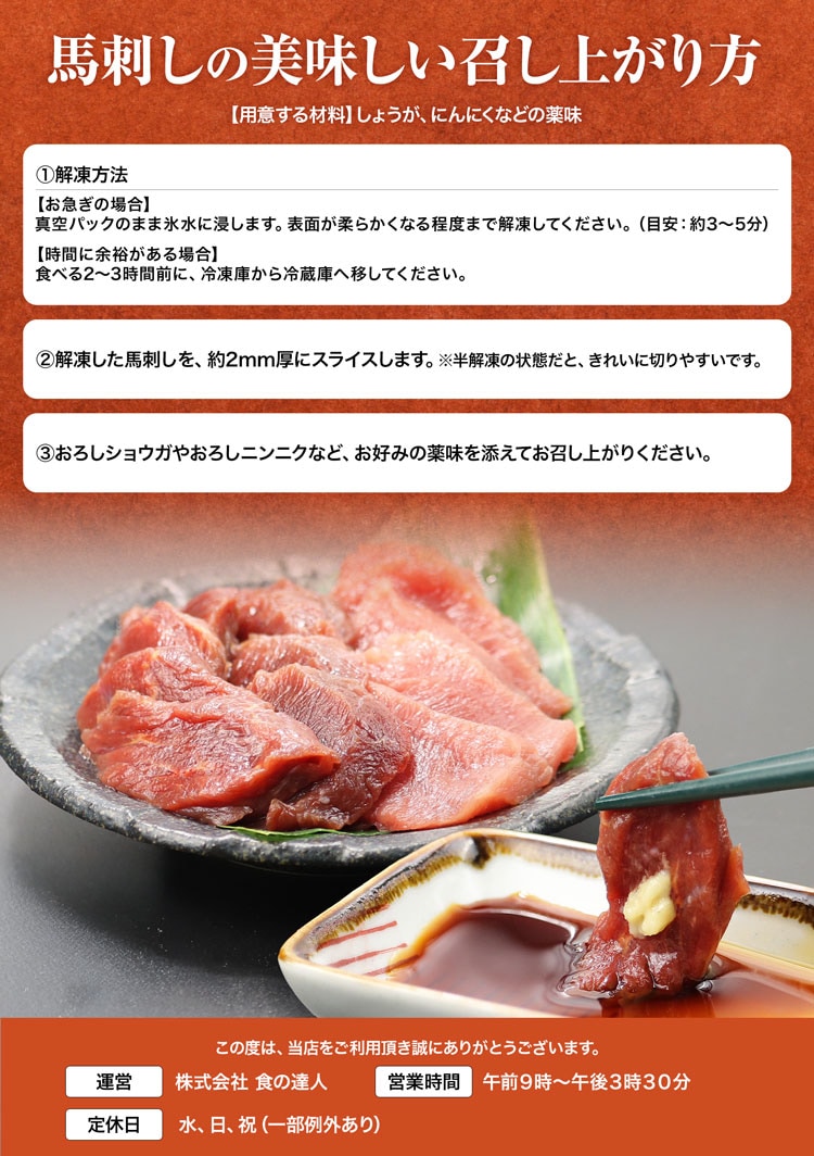 解凍するだけで、本格的な馬刺しの美味しさを手軽に楽しめます。
