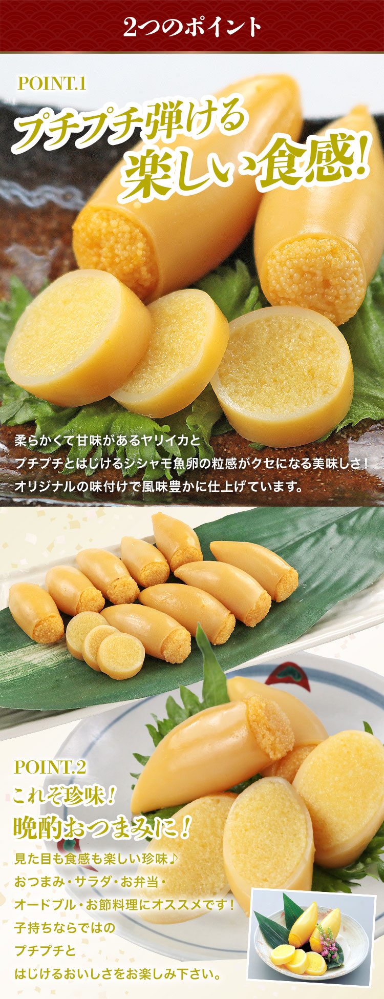 いか魚卵詰め(やりいか、カラフトししゃも卵、魚肉すり身、食塩)、しょうゆ、砂糖混合異性化液糖、還元水飴、醸造調味料/調味料(アミノ酸等)、酸味料、カロチノイド色素、リン酸塩(Na)、(一部に小麦・いか・大豆・ゼラチンを含む)