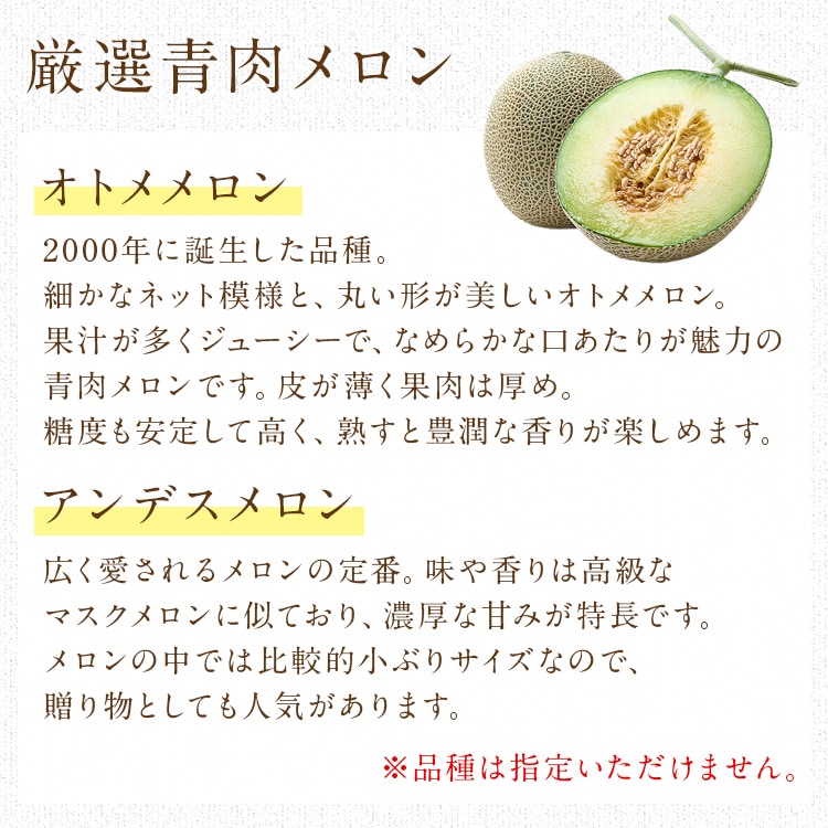 品種はおまかせ。オトメメロン・アンデスメロンのいずれかになります。
