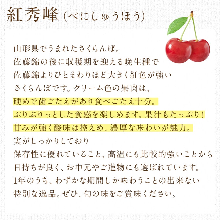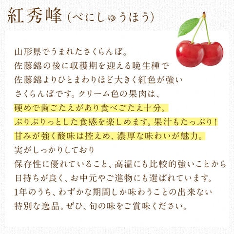さくらんぼ 500g 紅秀峰 山形県産 秀品 Lサイズ以上 べにしゅうほう 贈り物 贈答 サクランボ 産直【6月中旬~下旬頃・期間内出荷予定】