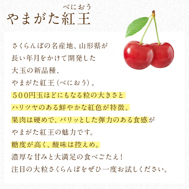 さくらんぼ 500g 大粒 山形県産 やまがた紅王 秀品 2Lサイズ べにおう 贈答 ギフト 贈り物 産直【6月中旬~下旬頃・期間内発送予定】のレビュー