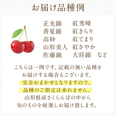 佐藤錦、紅秀峰、紅きらり、紅てまり、大将錦など。