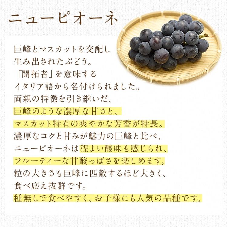 ニューピオーネは、巨峰とマスカットを交配し生み出されたぶどうです。