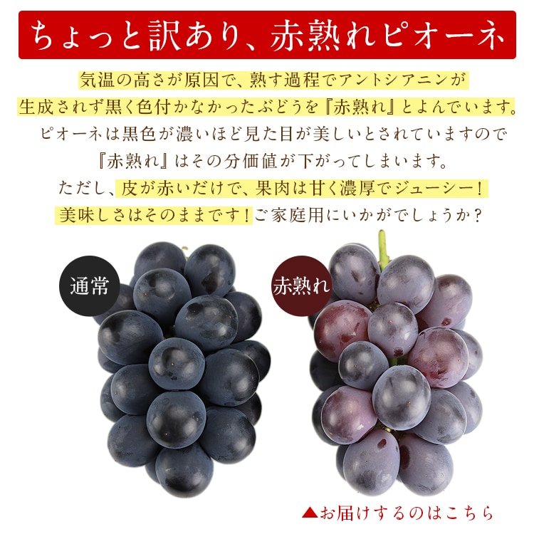 気温の高さが原因で、黒く色付かなかったぶどうを『赤熟れ』とよんでいます。 見た目はやや劣りますが、果皮が赤みがかっているだけで、美味しさはそのまま。
