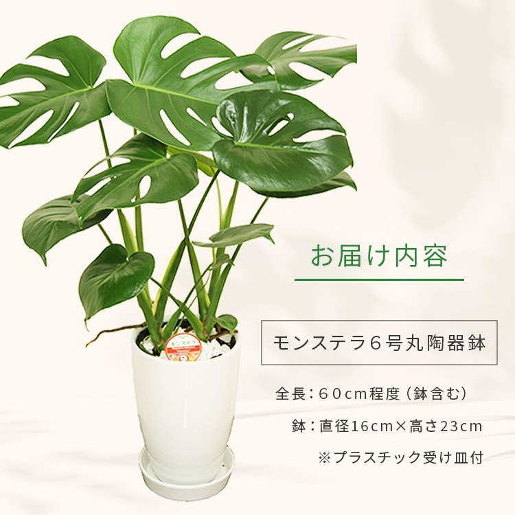 | 商品:モンステラ6号丸陶器鉢 サイズ:全長60cm程度(鉢含む)※個体差あり 鉢サイズ:直径16cm×高さ23cm、プラスチック受皿付き 出荷元:熊本県(松村農園) ※商品についてのお問い合わせは販売店(食の達人お取り寄せグルメ)までお願いします。 配送タイプ:常温便 |