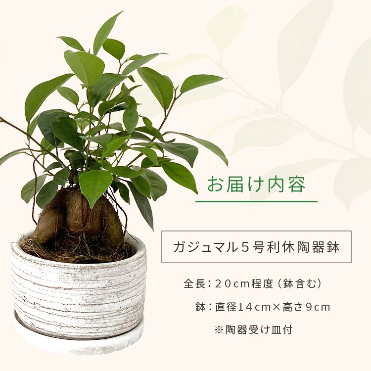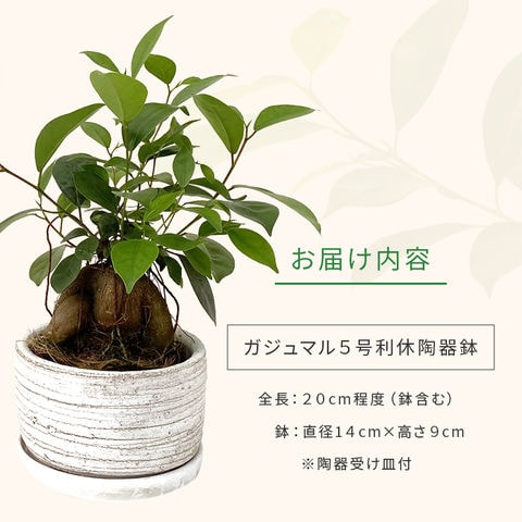 | 商品:ガジュマル5号利休陶器鉢 サイズ:全長20cm程度(鉢含む)※個体差あり 鉢サイズ:直径14cm×高さ9cm、陶器受皿付き 出荷元:熊本県(松村農園) ※商品についてのお問い合わせは販売店(食の達人お取り寄せグルメ)までお願いします。 配送タイプ:常温便 |