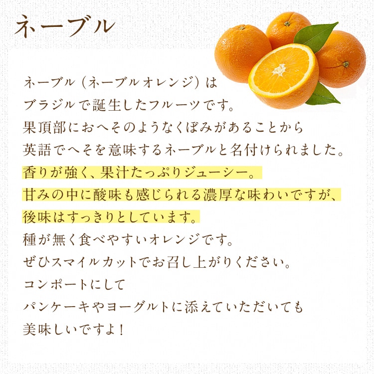 | 【商品名】ネーブル 【産地】広島県 【内容量】20~25玉程度、合計約5kg 【配送タイプ】常温便 【賞味期限】生鮮品の為、賞味期限の記載なし |