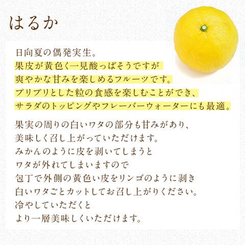 | 【商品名】はるか 【産地】広島県 【内容量】合計約3kg 【サイズ】M~2Lサイズ 【配送タイプ】時期により、常温便→冷蔵便でのお届けに切り替わります。予めご了承くださいませ。 【賞味期限】生鮮品の為、賞味期限の記載なし |