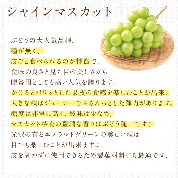 種が無く皮ごと食べられる手軽さで大人気の、シャインマスカット!