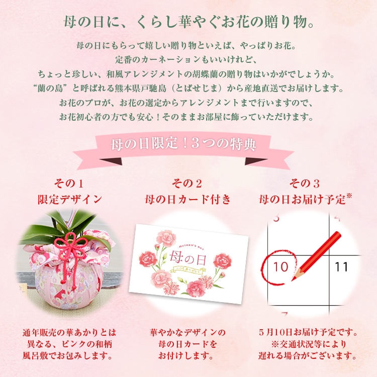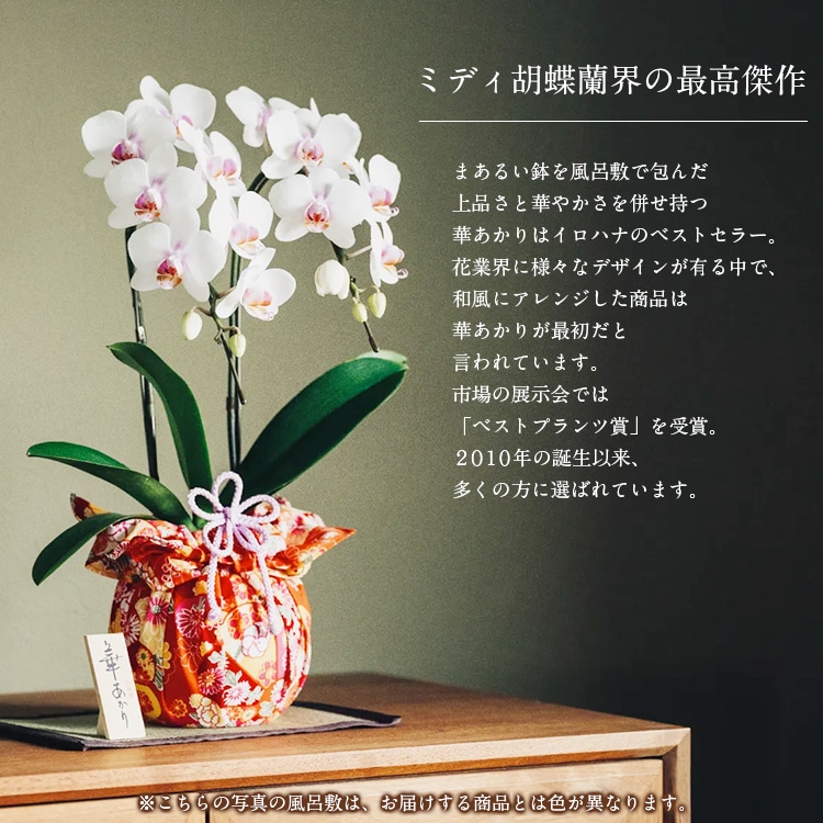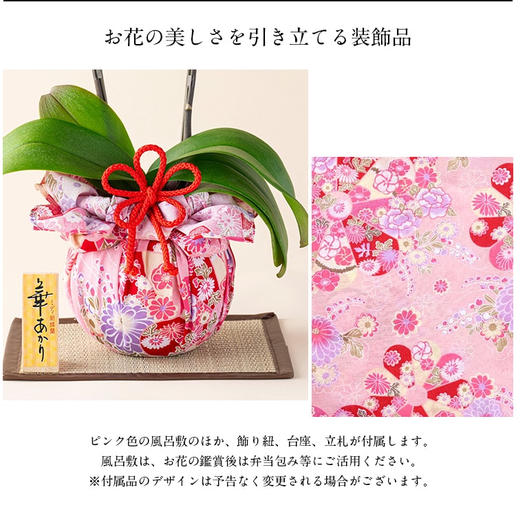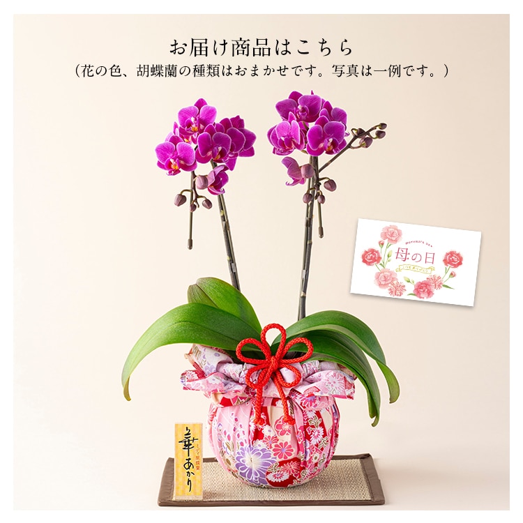 【セット内容】ミディ胡蝶蘭、母の日カード、台座、立札(風呂敷、飾り紐※本体にセット済み)