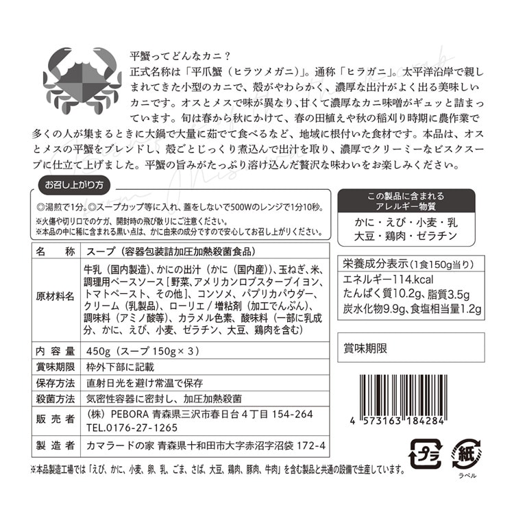| 【名称】 スープ(容器包装詰加圧加熱殺菌食品) 【原材料名】 牛乳(国内製造)、かにの出汁(かに(国内産))、玉ねぎ、米、調理用ベースソース〔野菜、アメリカンロブスターブイヨン、トマトペースト、その他〕、コンソメ、パプリカパウダー、クリーム(乳製品)、ローリエ/増粘剤(加工でんぷん)、調味料(アミノ酸等)、カラメル色素、酸味料(一部に乳成分、かに、えび、小麦、ゼラチン、大豆、鶏肉を含む) 【内容量】 〔450g(スープ150g×3)〕×2セット 【賞味期限】 商品記載(※商品発送後約60日) 【保存方法】 直射日光を避け常温で保存 【殺菌方法】 気密性容器に密封し、加圧加熱殺菌 【配送タイプ】 常温 |