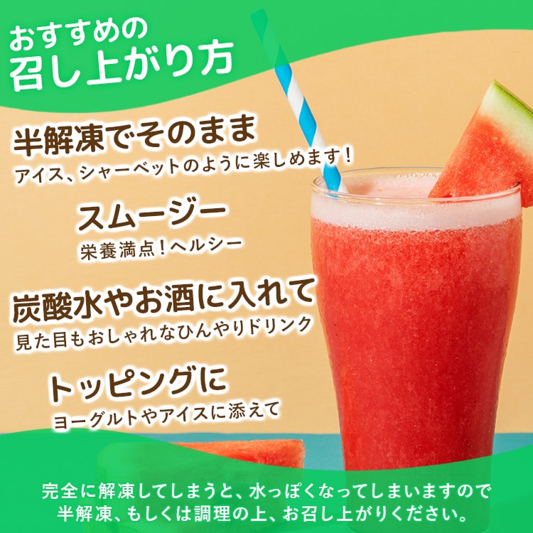 | 国産すいかを急速冷凍。美味しさを閉じ込めました。 便利な100g小分けパックでお届けします。 ※完全に解凍してしまうと、水っぽくなってしまいますので 半解凍、もしくは調理の上、お召し上がりください。 <商品詳細> 【名称】冷凍果実 【原材料】スイカ(国産) 【内容量】100g×10 【保存方法】冷凍(ー18℃以下で保存) 【賞味期限】商品記載(※ご家庭用の冷凍庫の場合、2か月を目安にお早目にお召し上がり下さい。) 【喫食方法】冷蔵解凍30分~1時間でお召し上がりいただけます。 【取り扱い注意点】 ・再凍結は品質劣化のもとになります。 ・解凍後は使い切ってください。 ・開封後は徐々に変色します。 ・開封後、なるべく早くお使いください。 |