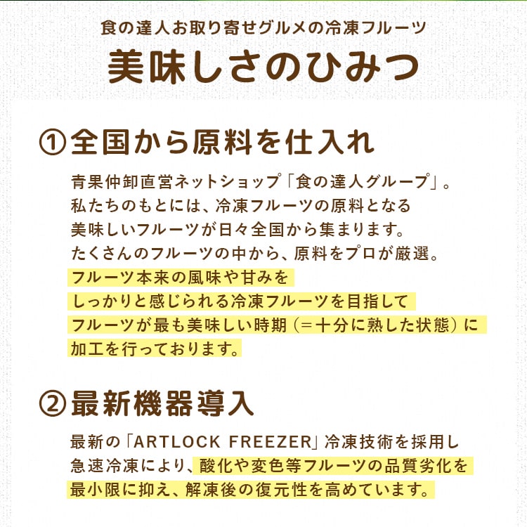 | 国産メロンを急速冷凍。美味しさを閉じ込めました。 便利な100g小分けパックでお届けします。 ※完全に解凍してしまうと、水っぽくなってしまいますので 半解凍、もしくは調理の上、お召し上がりください。 <商品詳細> 【名称】冷凍果実 【原材料】メロン(国産) 【アレルギー28品目】メロン 【内容量】100g×10 【保存方法】冷凍(ー18℃以下で保存) 【賞味期限】商品記載(※ご家庭用の冷凍庫の場合、2か月を目安にお早目にお召し上がり下さい。) 【喫食方法】冷蔵解凍30分~1時間でお召し上がりいただけます。 【取り扱い注意点】 ・再凍結は品質劣化のもとになります。 ・解凍後は使い切ってください。 ・開封後は徐々に変色します。 ・開封後、なるべく早くお使いください。 |