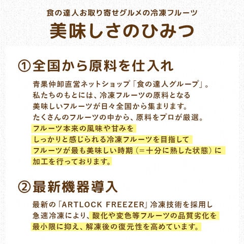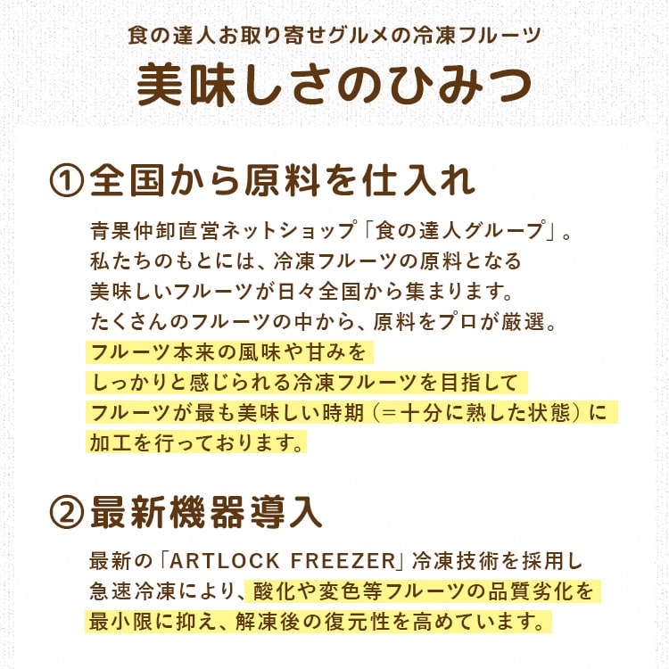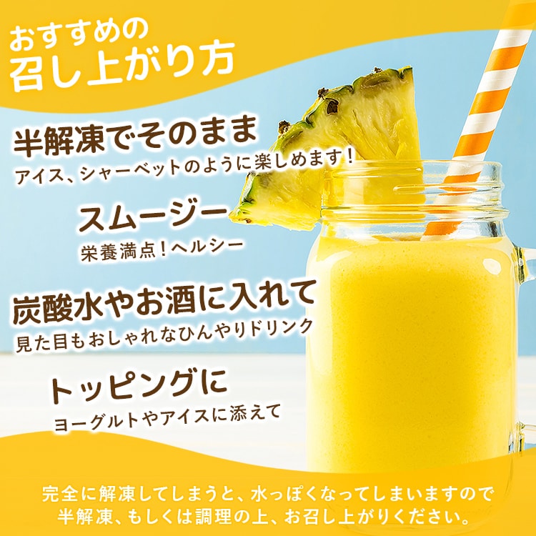 | 国産パイナップルを急速冷凍。美味しさを閉じ込めました。 便利な100g小分けパックでお届けします。 ※完全に解凍してしまうと、水っぽくなってしまいますので 半解凍、もしくは調理の上、お召し上がりください。 <商品詳細> 【名称】冷凍果実 【原材料】パイン(国産) 【内容量】100g×10 【保存方法】冷凍(ー18℃以下で保存) 【賞味期限】商品記載(※ご家庭用の冷凍庫の場合、2か月を目安にお早目にお召し上がり下さい。) 【喫食方法】冷蔵解凍30分~1時間でお召し上がりいただけます。 【取り扱い注意点】 ・再凍結は品質劣化のもとになります。 ・解凍後は使い切ってください。 ・開封後は徐々に変色します。 ・開封後、なるべく早くお使いください。 |